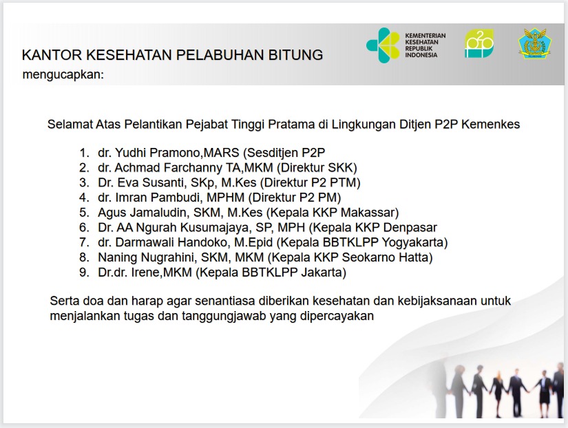 Berita 04/09/202217/02/2023 Selamat Atas Pelantikan Pejabat Tinggi Pratama Di Lingkungan Ditjen P2P Kemenkes RI Diposkan Oleh:Angreyni Putri Bukasiang 0 Komentar Spread the love