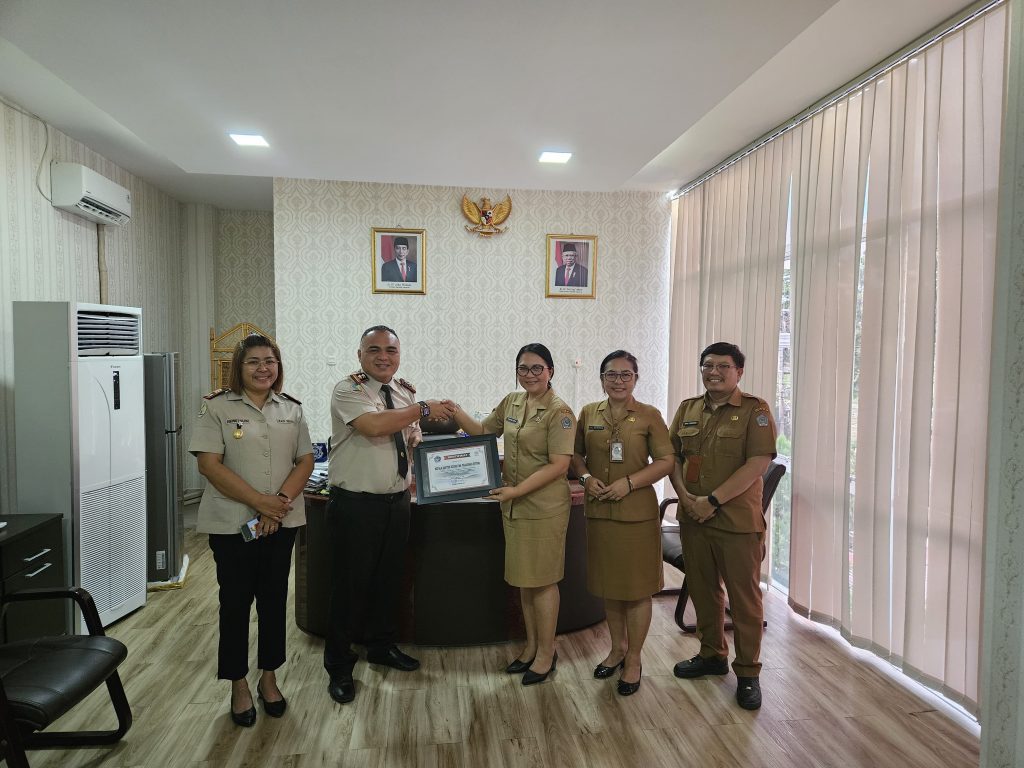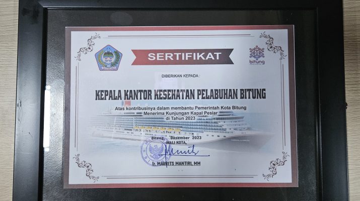 Walikota Bitung Bapak Ir. Maurits Mantiri, M.M. menganugerahkan penghargaan kepada Balai Kekarantinaan Kesehatan Kelas II Bitung atas kotribusi membantu pemerintah Kota Bitung menerima kunjungan kapal pesiar di tahun 2023