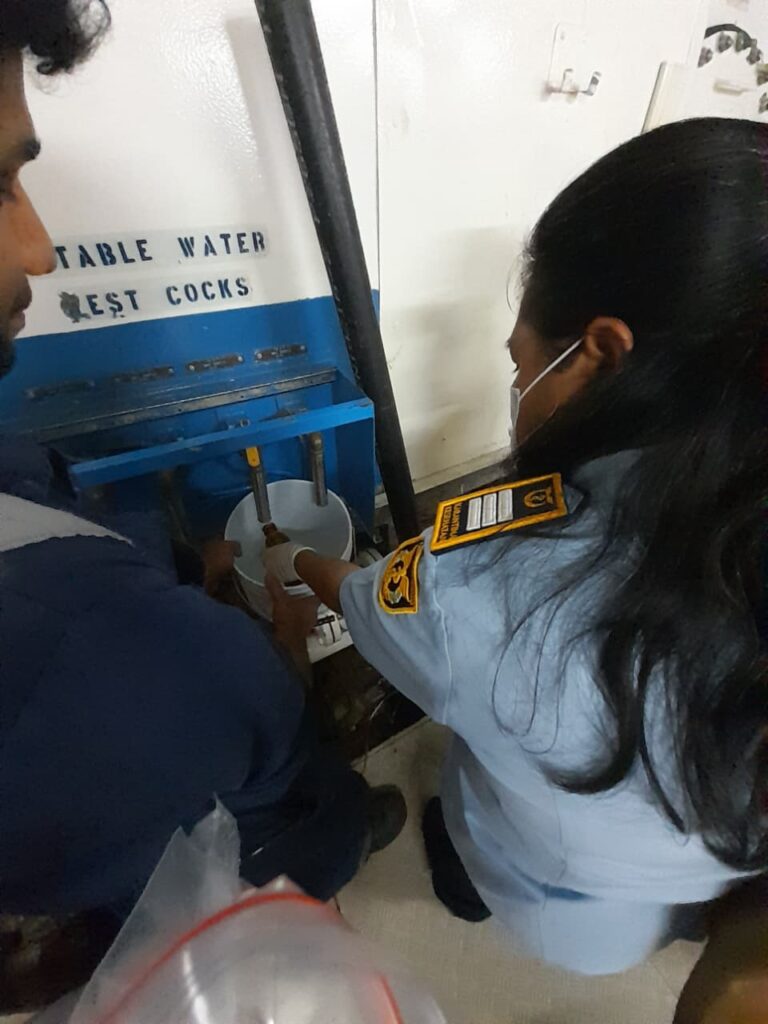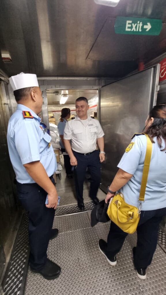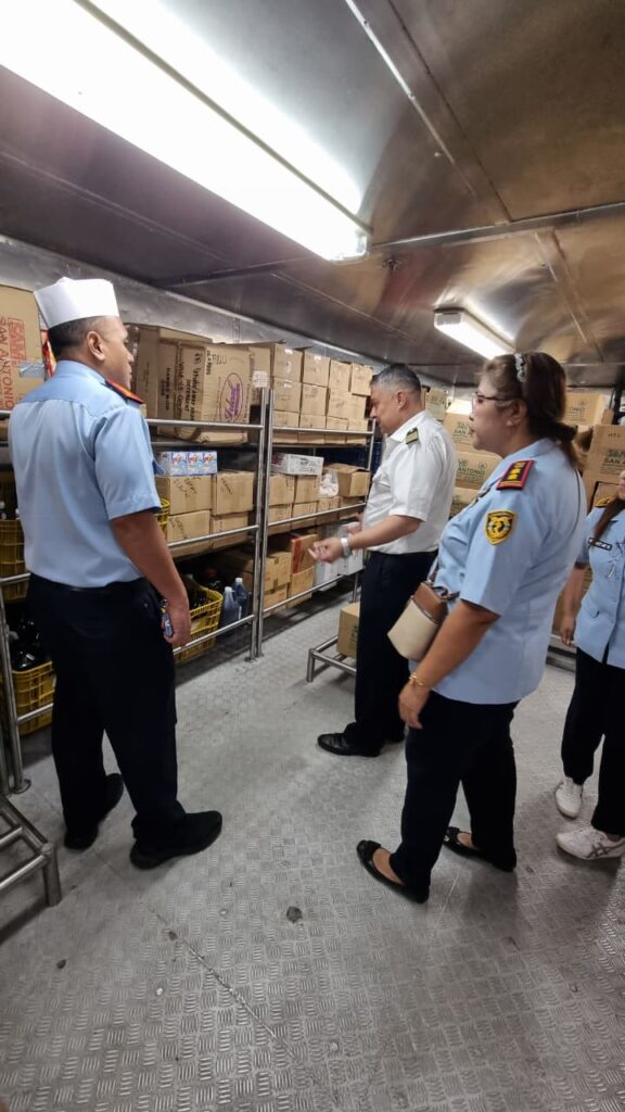 Selanjutnya, petugas melakukan pengawasan terhadap tempat pengelolaan dan penyimpanan makanan di atas kapal. Pemeriksaan meliputi aspek kebersihan dapur, penyimpanan bahan pangan, peralatan masak, serta kondisi ruang makan. Semua kegiatan dilakukan dengan mengacu pada standar kebersihan dan keamanan pangan internasional untuk mencegah potensi kontaminasi makanan yang dapat menimbulkan penyakit bawaan pangan (foodborne diseases).